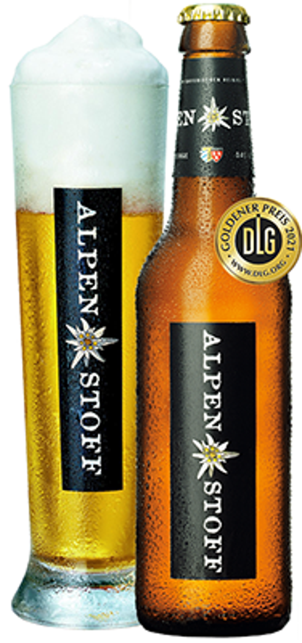 Seine Kraft schöpft der ALPENSTOFF aus seiner großzügig bemessenen Stammwürze, Reinheit und Klarheit verdankt er der Verwendung höchst erlesener Rohstoffe, reinem Brauwasser aus den Berchtesgadener Alpen und einem außergewöhnlich aufwändigen Gärverfahren.